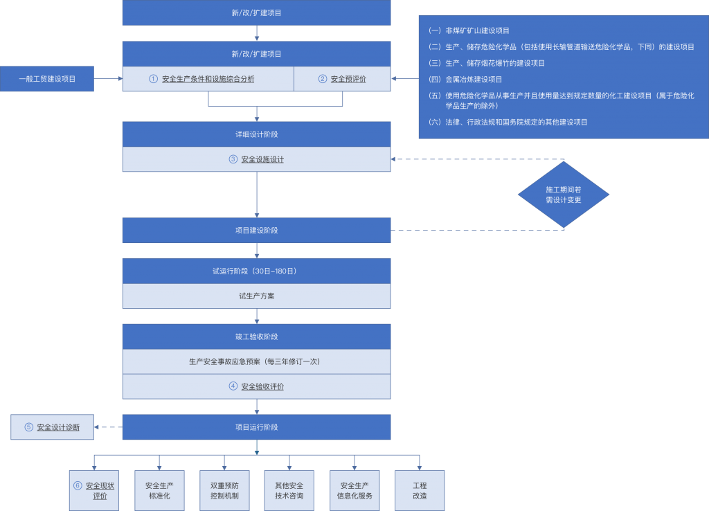 针对项目的实施阶段,为客户提供安全生产条件和设施综合分析/安全预评价、安全设施设计、安全验收评价、安全设计诊断、安全现状评价等各类安全评价及其他安全相关服务